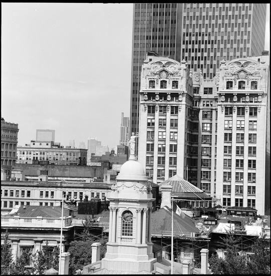["Justice" statue on cupola of City Hall, with "Civic Fame" statue on tower of Municipal Building in background.]