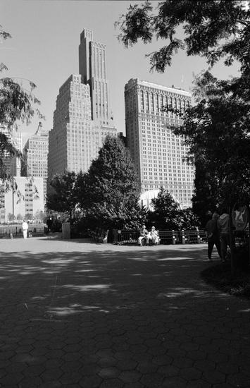 [Looking north from the South Cove of the Battery Park City esplanade to the twin towers of the World Trade Center.]