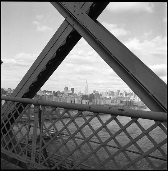 [Looking northeast over the East River beyond the approach to the Manhattan Bridge to the Empire State Building.]