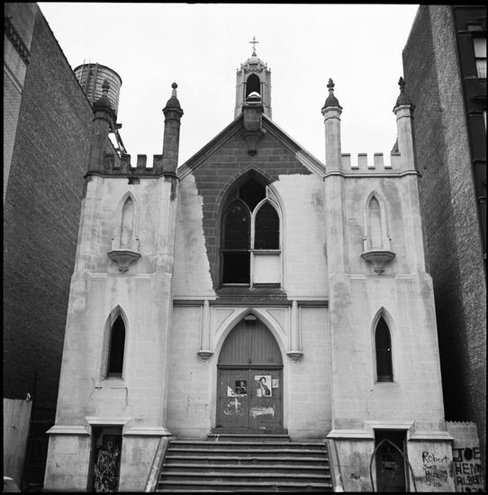 [Boarded up row houses on the north side of East 7th Street, near the corner of Avenue C.]