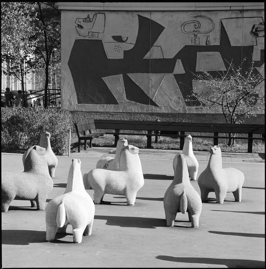 [Cast-stone horses, Stephen Wise Towers playground.]