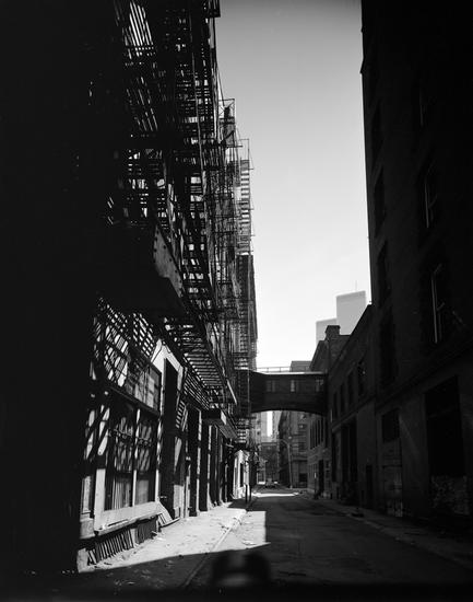 [Staple Street, showing footbridge between old House of Relief and ambulance annex of the New York Hospital.]