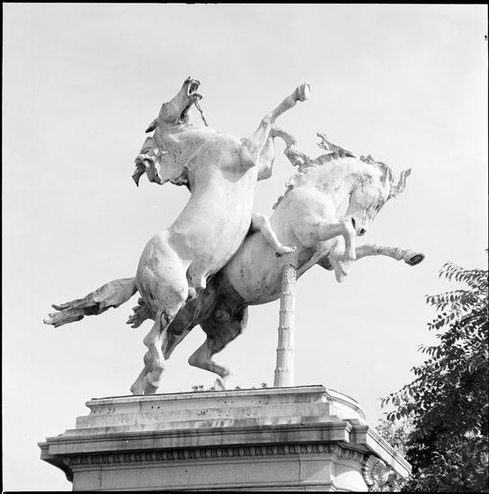 ["Horse Tamers" bronze group on granite pedestal.]