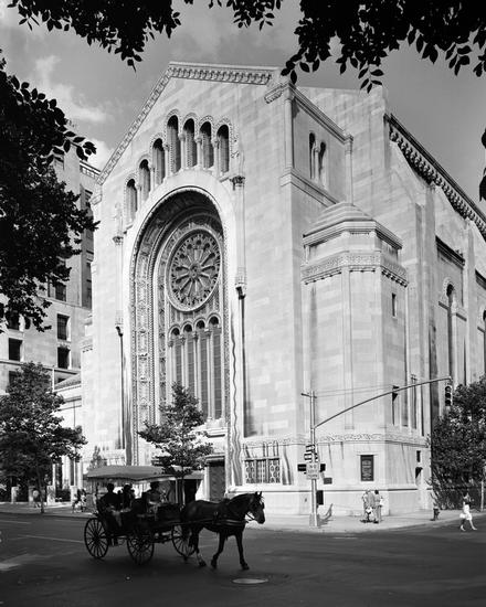 [Horse-drawn carriage passing Temple Emanu-El.]