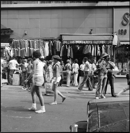 [Clothes for sale in front of 104-106 Rivington Street.]