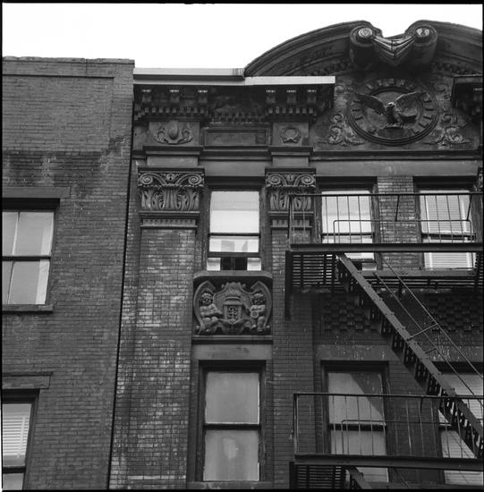 [58 East 4th Street. Modillioned cornice with broken pediment featuring eagle figure.]