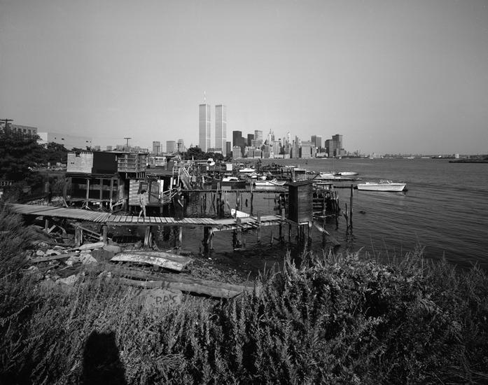 [Looking east from a deteriorated dock in New Jersey to the Lower Manhattan skyline.]