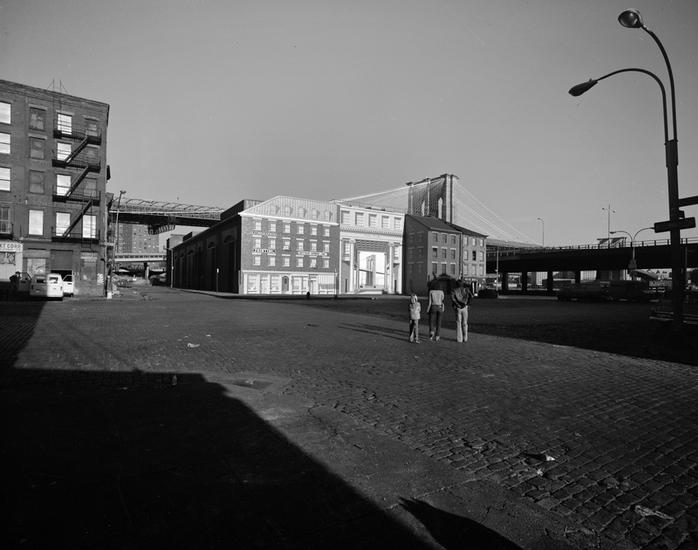 [Trompe l'oeil concealing a Con Ed substation at 237-257 Front Street, and the Jasper Ward house, 45 Peck Slip.]