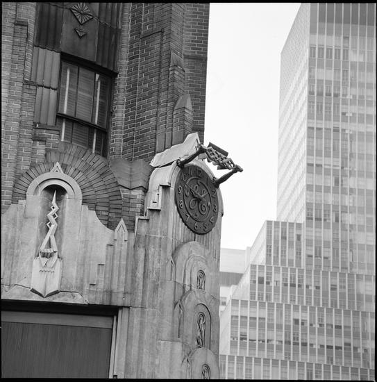 [Detail of clock and sculpture on the Helmsley Building, 230 Park Avenue.]
