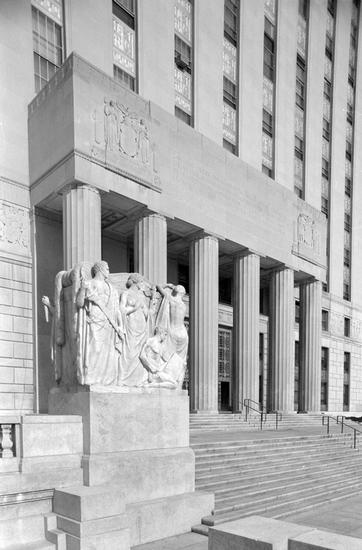[Statuary in front of the Bronx County Building, 851 Grand Concourse.]