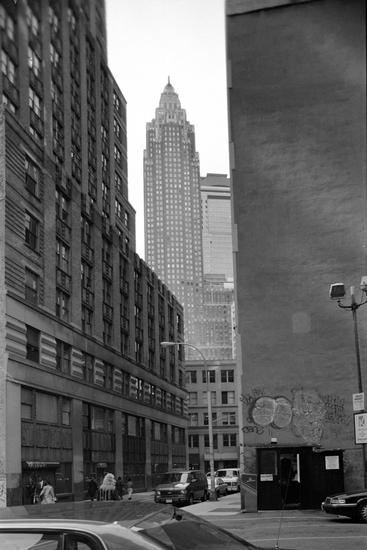 [Looking at 70 Pine Street from the steps of Federal Hall.]