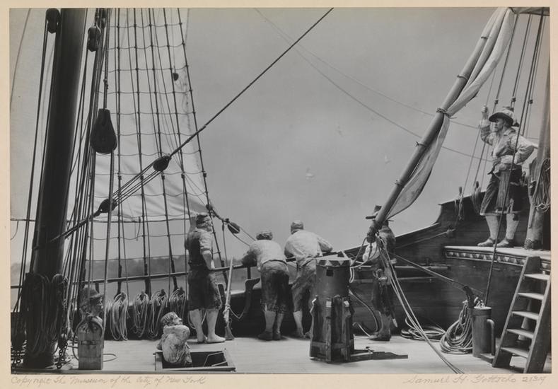 [The "Half Moon" in New York Harbor, 1609. Two photographs of a miniature group installed in the Marine Museum at the Museum of the City of New York.]