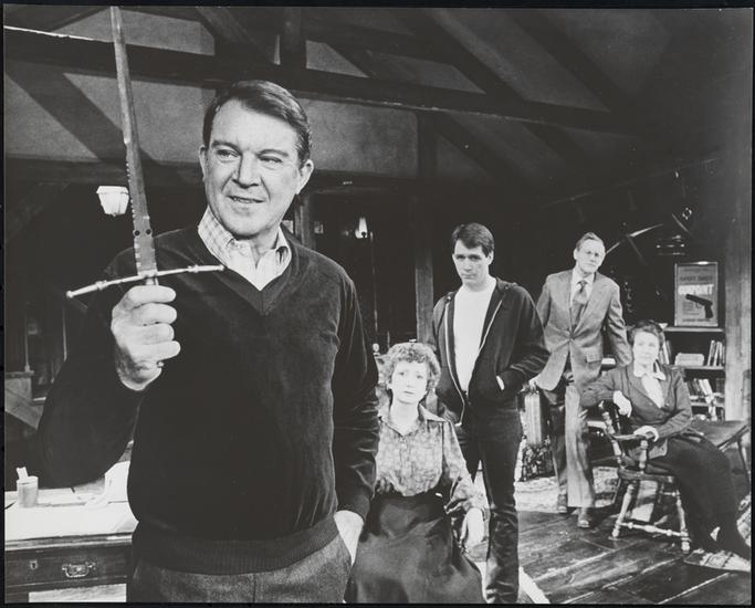 [Donald Barton as Sidney Bruhl, Patricia Guinan as Myra Bruhl and Michael McBride as Clifford Anderson in "Deathtrap".]