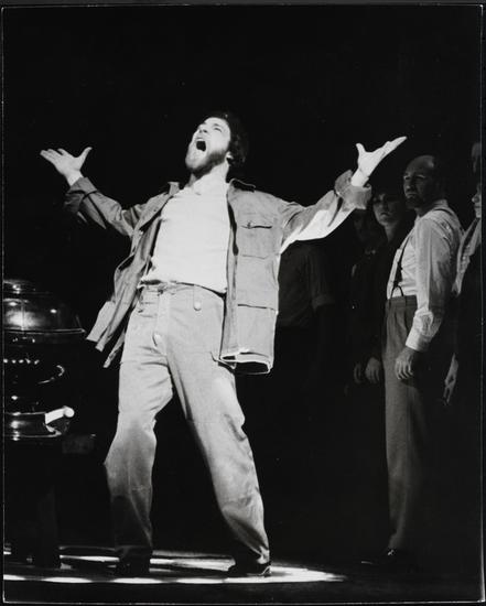 [Mandy Patinkin as Che, Patti LuPone as Eva Perón and Bob Gunton as Perón in "Evita".]