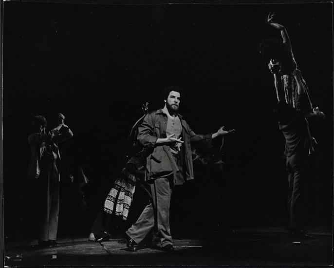 [Mandy Patinkin as Che, Patti LuPone as Eva Perón and Bob Gunton as Perón in "Evita".]