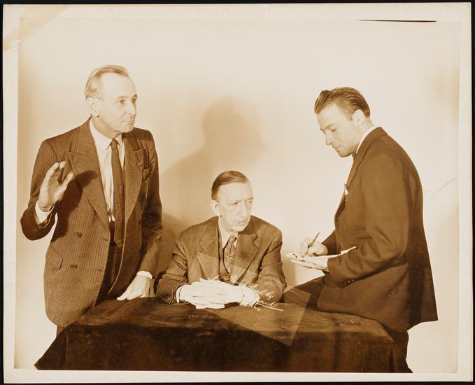 [Dayton Lummis as Senator Lawrence, Lorraine MacMartin as Mrs. Harkness and Gregory Robbins as Jim Nailey in "According to Law".]