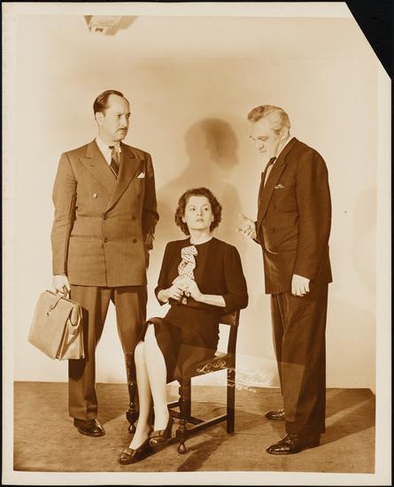 [Dayton Lummis as Senator Lawrence, Lorraine MacMartin as Mrs. Harkness and Gregory Robbins as Jim Nailey in "According to Law".]