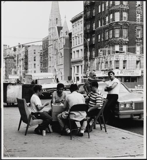 [Men playing dominoes on the sidewalk.]