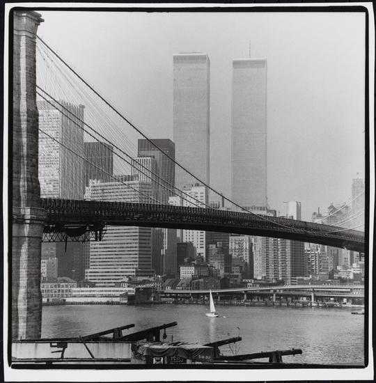 [Looking southwest across the East River to the Brooklyn Bridge and the twin towers of the World Trade Center.]
