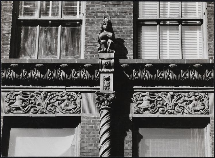 [Stone elves on unidentified corner building façade between stone base and upper section of brick.]