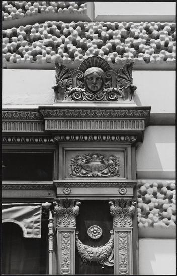 [Decorative clock on the side of an unidentified building, possibly a bank.]