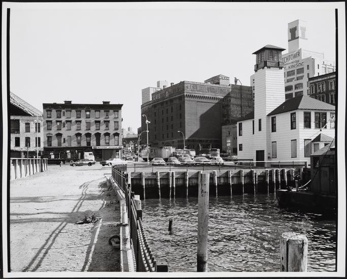 [Looking east toward the corner of Old Fulton and Water Streets from the edge of the East River.]