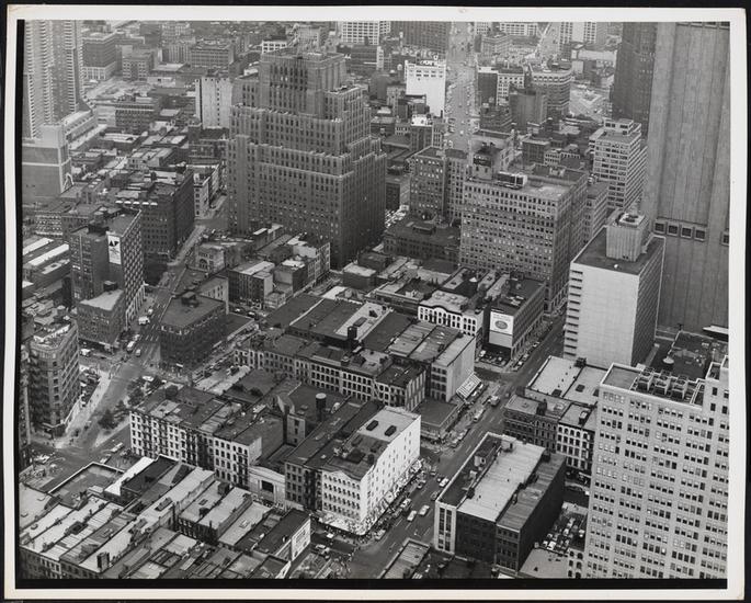 [Aerial view of the rooftops of Schermerhorn Row.]