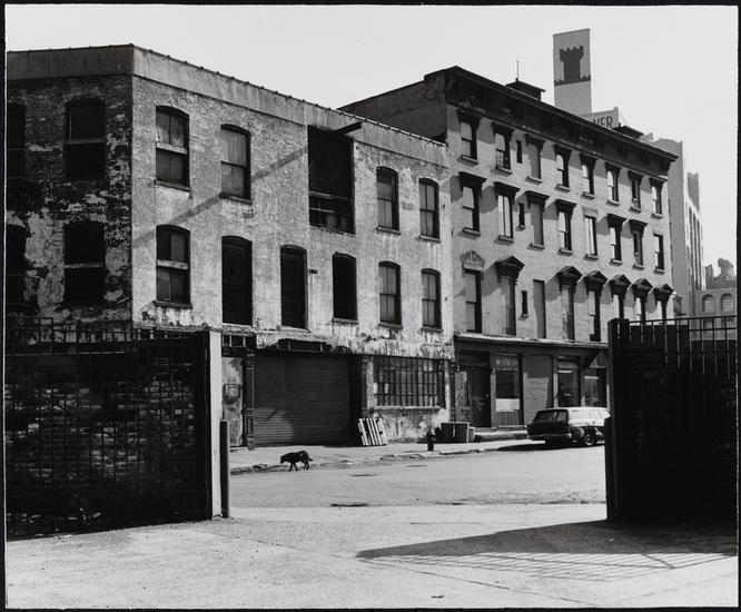 [Looking east toward the corner of Old Fulton and Water Streets from the edge of the East River.]