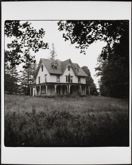 [Unidentified wooden frame house with a sign reading "Fire 734".]