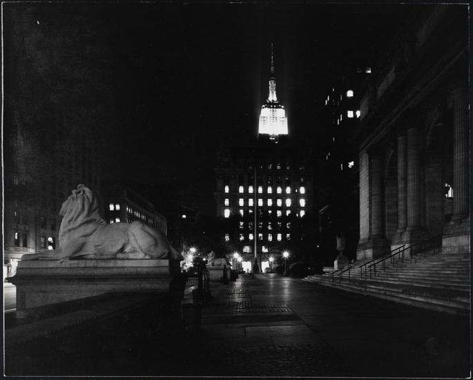 [Looking south from the steps of New York Public Library's main branch toward the Empire State Building.]