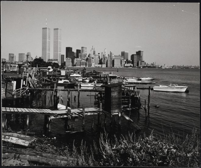 [Looking east from a deteriorated dock in New Jersey to the Lower Manhattan skyline.]