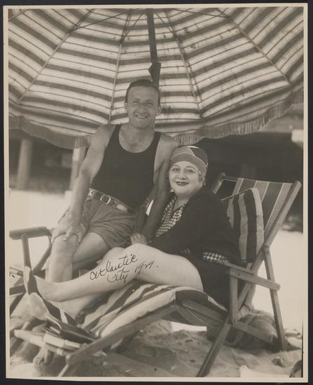 [Sophie Tucker and husband Al Lackey at the beach.]