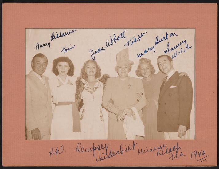 [Sophie Tucker with group of people at the Hollywood Beach Hotel.]