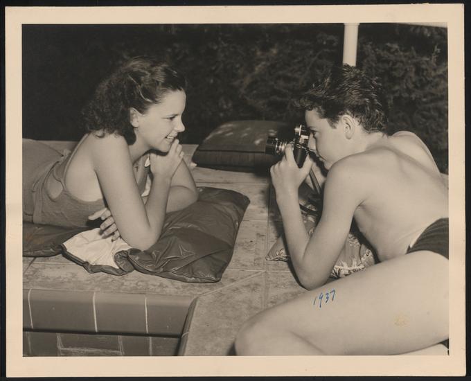 [Judy Garland, Freddie Bartholomew and Sophie Tucker at a pool party.]