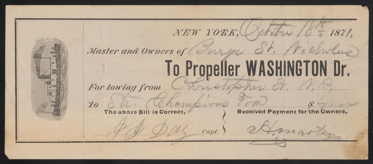 Receipt for towing services for Barge St. Nicolas from Propeller S. F. Washington, Dr.