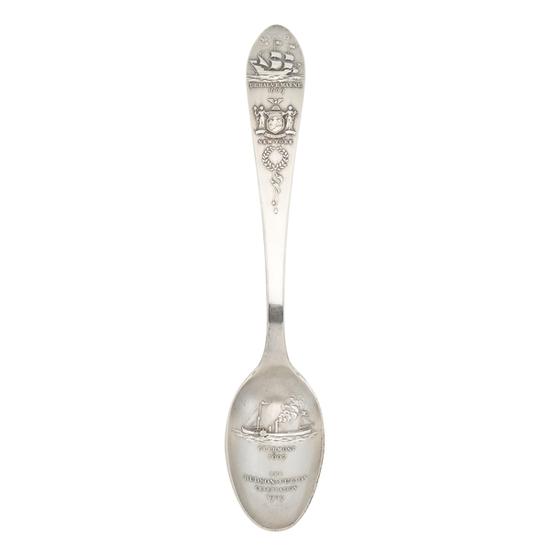 Souvenir spoon with image of Robert Fulton's "Clermont" paddle steamship in bowl, Henry Duson's "De Halve Maene" (The Half Moon) ship at handle tip, and seal of the State of New York above laurel wreath. Inscription: In spoon bowl in relief: Clermont / 1807 / The Hudson-Fulton / Celebration / 1909. On handle obverse: DE HALVE MAENE / 1609 / NEW YORK. Mark: Marked on handle reverse: TIFFANY AND CO. [diamond ]STERLING [Gothic M.]