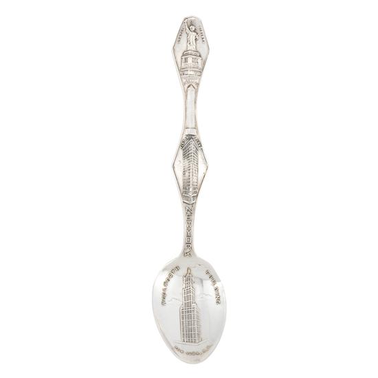Souvenir spoon with images of the Statue of Liberty, Obelisk, and Flatiron Building on handle obverse, Woolworth Building in bowl obverse, and Brooklyn Bridge on handle reverse. Inscription: On handle obverse: STATUE OF LIBERTY / OBELISK / FLATIRON BLDNG / NEW YORK. On bowl obverse: WOOLWORTH BUILDING/ NEW YORK, N.Y. On handle reverse: BROOKKLYN BRIDGE. Mark: Marked on handle reverse: [P within a heart] [& within a heart] [B within a heart] STERLING.
