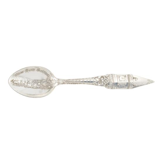 Souvenir spoon with image of the New York Tribune clock tower at handle tip with farming and industrial scene in bowl. Inscription: On bowl obverse in raised lettering: NEW-YORK TRIBUNE. Mark: Marked on handle reverse: STERLING.