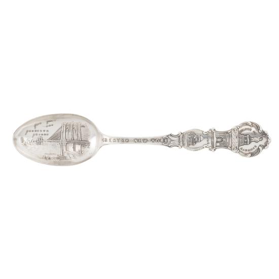 Souvenir spoon inscribed Greater New York on handle with images of the Statue of Liberty, Grant's Tomb, and Washington Arch on handle. Image of Brooklyn Bridge in bowl. Inscription: Stamped on spoon obverse: GREATER-NEW-YORK / GRANT'S / TOMB / WASHINGTON / ARCH/ STATUE OF LIBERTY. Stamped on interior of bowl: NEW YORK / AND / BROOKLYN / BRIDGE. Mark: Marked on handle reverse: [Alvin Manufacturing Co. trademark] STERLING.