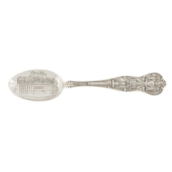 Souvenir spoon with images of seal of the City of New York, Grant's Tomb, Soldiers' and Sailors' Monument, and Flatiron Building on handle obverse, City Hall in bowl, and Brooklyn Bridge, Statue of Liberty, Park Row Building, and Obelisk on handle reverse. Inscription: On handle obverse in raised lettering: CITY SEAL / GRANT'S TOMB / SOLDIERS SAILORS / MONUMENT/ FT IRON / BLD'NG / NEW YORK. On bowl obverse: CITY HALL / NEW YORK. On handle reverse: BROOKLYN / BRIDGE / STATUE OF LIBERTY / PARK ROW BLDNG / OBELISK. Engraved in script on bowl reverse: MSG. Mark: Marked on handle reverse: STERLING.