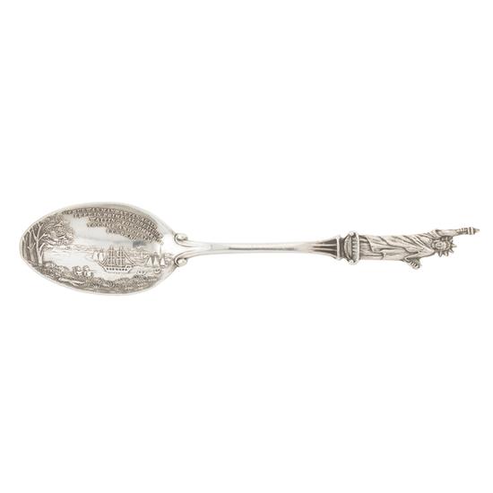Souvenir spoon with end of handle in the shape of the Statue of Liberty. Bowl inscribed with image of pastoral scene of Native Americans and ships on the Hudson. Inscription: Inscribed in bowl of spoon in relief: "Thus was Manhattan again / left in primeval solitude, / waiting for commerce / to come and claim / its own." Mark: Marked on back of handle: [griffin] [letter A in shield] [sword and crescent moon] STERLING.