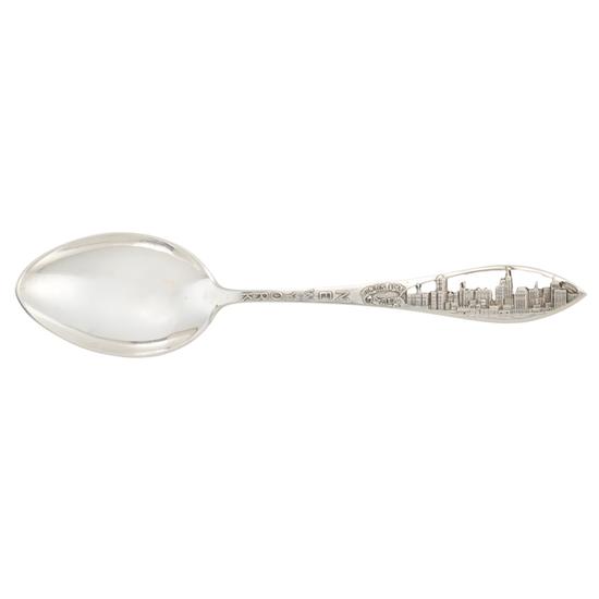 Souvenir spoon with plain bowl and cut-out handle of bird's eye view of the New York City skyline. Inscription: On handle obverse in raised lettering: NEW YORK / BIRD'S EYE / VIEW. Mark: Marked on handle reverse: [crown] [Gothic W] [lion passant] STERLING.