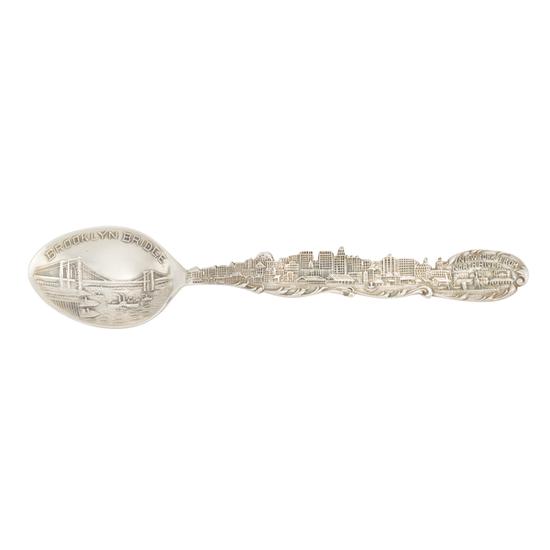 Souvenir spoon with image of the Brooklyn Bridge and East River in bowl and handle in the shape of New York City skyline from the North River. Inscription: On bowl obverse in raised lettering: BROOKLYN BRIDGE. On handle obverse: NEW YORK FROM / NORTH RIVER. Mark: Marked on handle reverse: [P in heart] [& in heart] [B in heart] STERLING.