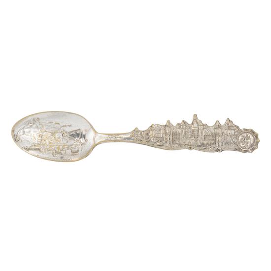 Souvenir spoon with handle shaped in depiction of Luna Park, Coney Island, image of Mountain Torrent amusement ride at Luna Park on bowl obverse, and anthropomorphic moon at handle end. Inscription: On handle obverse in raised relief: SOUVENIR / - LUNA PARK - / CONEY ISLAND. On bowl obverse in raised relief: MOUNTAIN TORRENT. Mark: Marked on handle reverse: COPYRIGHT 1907. F.S.& S.M.