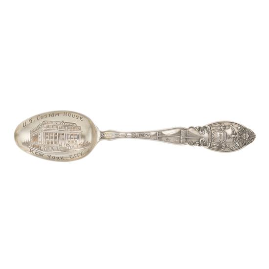 Souvenir spoon with image of the U.S. Customs House engraved on bowl obverse, Brooklyn Bridge New York State seal on handle obverse, and images of Niagara Falls, Buffalo and Native American in canoe on handle reverse. Marked by Manchester Manufacturing Co. later named the Manchester Silver Co. Inscription: Engraved on bowl obverse: U.S. CUSTOM HOUSE / NEW YORK, CITY. On handle obverse in raised relief: NEW YORK. Mark: Marked on handle reverse: STERLING [Manchester Manufacturing Co. trademark].