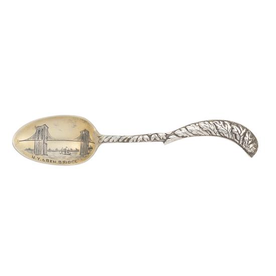Souvenir spoon with image of Brooklyn Bridge and East River in gilded bowl and curved handle decorated in leaf and wave motif Inscription: Engraved on bowl obverse: N.Y. & BKN. BRIDGE. Mark: Marked on handle reverse: [stag's head] RW & S STERLING.