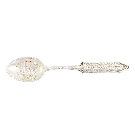 Souvenir spoon with image of Luna Park at Coney Island in bowl and handle in the shape of the Flatiron Building. Inscription: On bowl obverse in raised lettering: LUNA PARK N.Y. Mark: Marked on handle reverse: [P in heart] [& in heart] [B in heart] STERLING