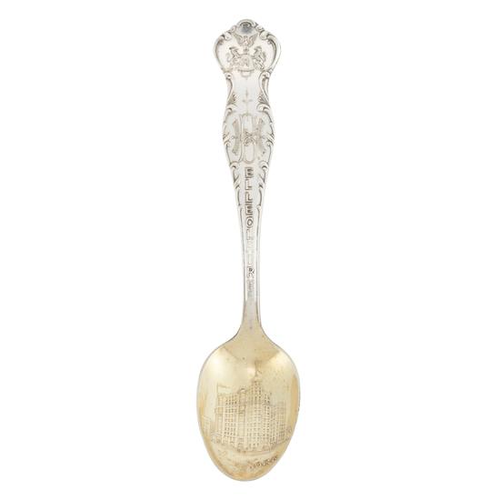 Souvenir spoon with image of Belleclaire Hotel in bowl obverse, coat-of-arms ay handle end, and image of the Brooklyn Bridge on handle reverse. Marked by U.S. Silver Co., part of Oneida Ltd. Inscription: On handle obverse, rubbed: BELLECLAIRE. On bowl obverse: NEW-YORK. Mark: Marked on handle reverse: U.S. SILVER CO.