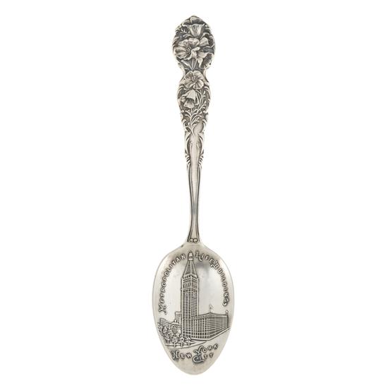 Souvenir spoon with image of the Metropolitan Life Building in bowl obverse and floral and scroll motif of handle obverse and reverse. Inscription: On bowl obverse in raised relief: METROPOLITAN LIFE BUILDING / NEW YORK / CITY. Mark: Marked on handle reverse: S STERLING.