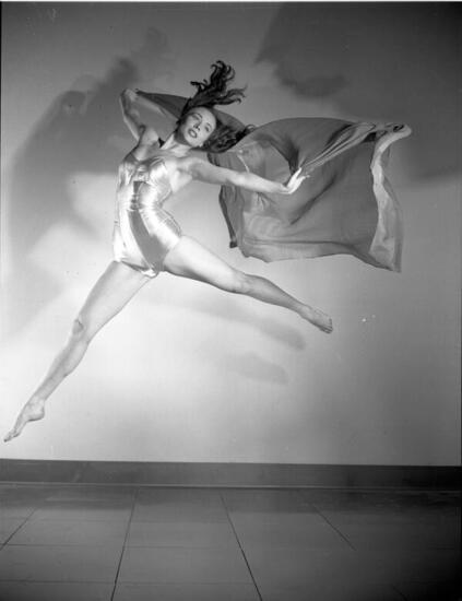 Photographs of ballerina Milada Mladova dancing while wearing a leotard and holding a scarf. Date of assignment January 29, 1947. Negative frames: 39